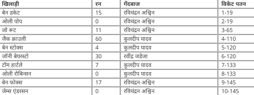 इंग्लैंड के लिए दूसरी पारी में ओपनर जैक क्राउली ही संघर्ष कर पाए. क्राउली ने 60 रनों की पारी खेली. क्राउली के अलावा जॉनी बेयरस्टो ने 30 रनों की पारी खेली. भारत की ओर से आर. अश्विन ने पांच और कुलदीप यादव ने चार विकेट लिए. अश्विन का ये 35वां 5 विकेट हॉल रहा. वहीं कुलदीप यादव ने चार और रवींद्र जडेजा ने एक विकेट लिया.
