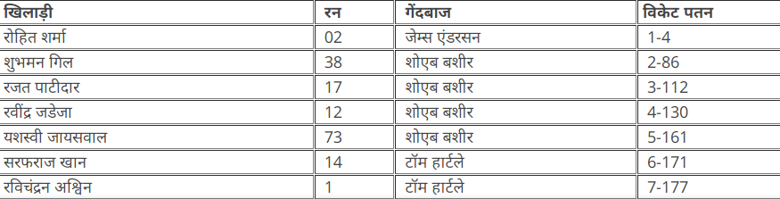 भारतीय टीम की ओर से पहली पारी में सबसे पहले आउट होने वाले बल्लेबाज कप्तान रोहित शर्मा रहे, जो महज 2 रनों पर विकेट के पीछे जेम्स एंडरसन की गेंद पर बेन फोक्स को कैच थमा बैठे. इसके बाद शुभमन गिल और यशस्वी जायसवाल ने मिलकर दूसरे विकेट के लिए 82 रनों की साझेदारी की. गिल जम चुके थे और लग रहा था वह बड़ी पारी खेलेंगे, लेकिन शोएब बशीर की एक गेंद को पढ़ नहीं पाए और उन्हें एलबीडब्ल्यू आउट होना पड़ा. बशीर ने इसके बाद रजत पाटीदार और रवींद्र जडेजा को भी सस्ते में आउट कर दिया.