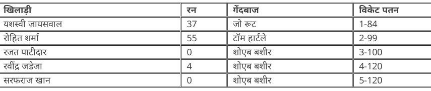 भारत को पहला झटका यशस्वी जायसवाल के रूप में लगा, जो पार्टटाइम स्पिनर जो रूट की गेंद पर जेम्स एंडरसन के हाथों लपके गए.यशस्वी के आउट होने के कुछ देर बाद रोहित ने अपनी फिफ्टी पूरी कर ली. रोहित 55 रन बनाकर टॉम हार्टले की गेंद पर विकेट के पीछे लपकेगए. फिर भारत ने रजत पाटीदार का भी विकेट गंवा दिया, जो अपना खाता भी नहीं खोल पाए.