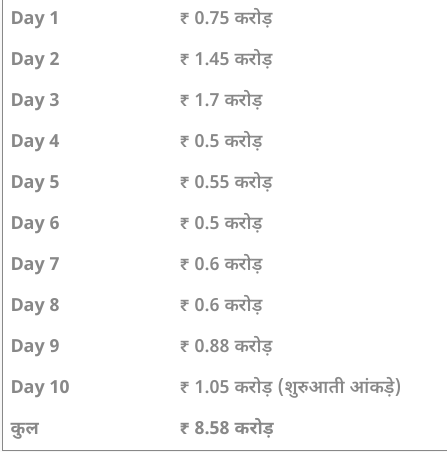 सैकनिल्क की रिपोर्ट की मानें तो संडे (10वें दिन) को भी ‘लापता लेडीज’ बॉक्स ऑफिस पर अच्छा कारोबार कर रही है. शुरुआती आंकड़ों के मुताबिक फिल्म अब तक 1.05 करोड़ रुपए कमा चुकी है. इसी के साथ फिल्म ने घरेलू बॉक्स ऑफिस पर कुल 8.58 करोड़ रुपए कमा लिए हैं.