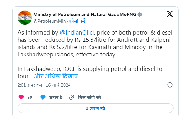 सोशल मीडिया एक्स पर पेट्रोलियम और नेचुरल गैस मंत्रालय ने पेट्रोल-डीजल के दाम में भारी कटौती की जानकारी है. मंत्रालय ने कहा कि लक्षद्वीप में, IOCL चार द्वीपों कवरत्ती, मिनिकॉय, एंड्रोट और कल्पेनी को पेट्रोल और डीजल की आपूर्ति करता है. IOCL के कवरत्ती और मिनिकॉय में डिपो हैं. इन डिपो में आपूर्ति केरल के कोच्चि में IOCL डिपो से की जाती है.