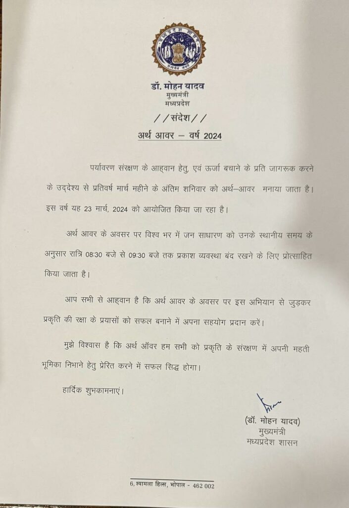 मध्य प्रदेश के मुखिया डॉक्टर मोहन यादव ने प्रदेश की जनता से मार्मिक अपील की है की पर्यावरण संरक्षण के आह्वान हेतु एवं ऊर्जा बचने के प्रति जागरूक करने के उद्देश्य से प्रति वर्ष मार्च महीने के अंतिम शनिवार को अर्थ- आवर मनाया जाता है। इस वर्ष यह २३ मार्च २०२४ को आयोजित किया जा रहा है। अर्थ आवर के अवसर पर विश्व भर में जान साधारण को उनके स्थानीय समय के अनुसार रात्रि ८:३० बजे से ९:३० बजे तक प्रकाश व्यवस्था बंद रखने के लिए प्रोत्साहित किया जाता है, “आप सभी से आह्वान है की अर्थ आवर के अवसर पर इस अभियान से जुड़कर प्रकृति की रक्षा के प्रयासों को सफल बनाने में अपना सहयोग प्रदान करें ”