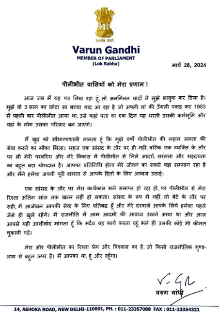 वरुण गांधी ने अपनी चिट्ठी में लिखा है कि मुझे वो 3 साल का छोटा सा बच्चा याद आ रहा है जो अपनी मां की उंगली पकड़ कर 1983 में पहली बार पीलीभीत आया था. उसे (तीन साल के बच्चे को) कहां पता था कि एक दिन यह धरती उसकी कर्मभूमि और यहां के लोग उसका परिवार बन जाएंगे. खुद को सौभाग्यशाली मानता हूं कि वर्षों पीलीभीत की महान जनता की सेवा करने का मौका मिला.