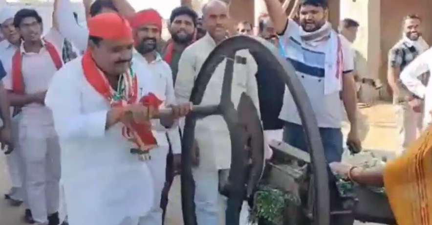 सपा प्रत्याशी ने मशीन से काटा हरा चारा