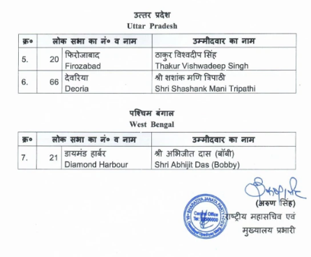 लोकसभा चुनाव के पहले चरण से ठीक तीन दिन पहले बीजेपी ने प्रत्याशियों की 12वीं लिस्ट जारी कर दी है. इस लिस्ट में उत्तर प्रदेश के देवरिया से शशांक मणि त्रिपाठी तो वहीं फिरोजाबाद से ठाकुर विश्वदीप सिंह को टिकट दिया गया है. अभिषेक बनर्जी के खिलाफ अभिजीत दास को उतारा गया है.