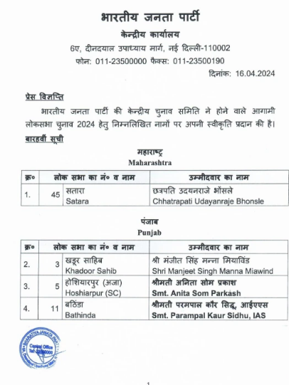 इससे पहले बीजेपी ने 11 अप्रैल को 11वीं लिस्‍ट जारी की थी. इस लिस्‍ट में सिर्फ एक ही प्रत्‍याशी का नाम था. बीजेपी नेउत्तर प्रदेश की भदोही लोकसभा सीट से डॉ. विनोद कुमार बिंद को उम्मीदवार बनाया था.