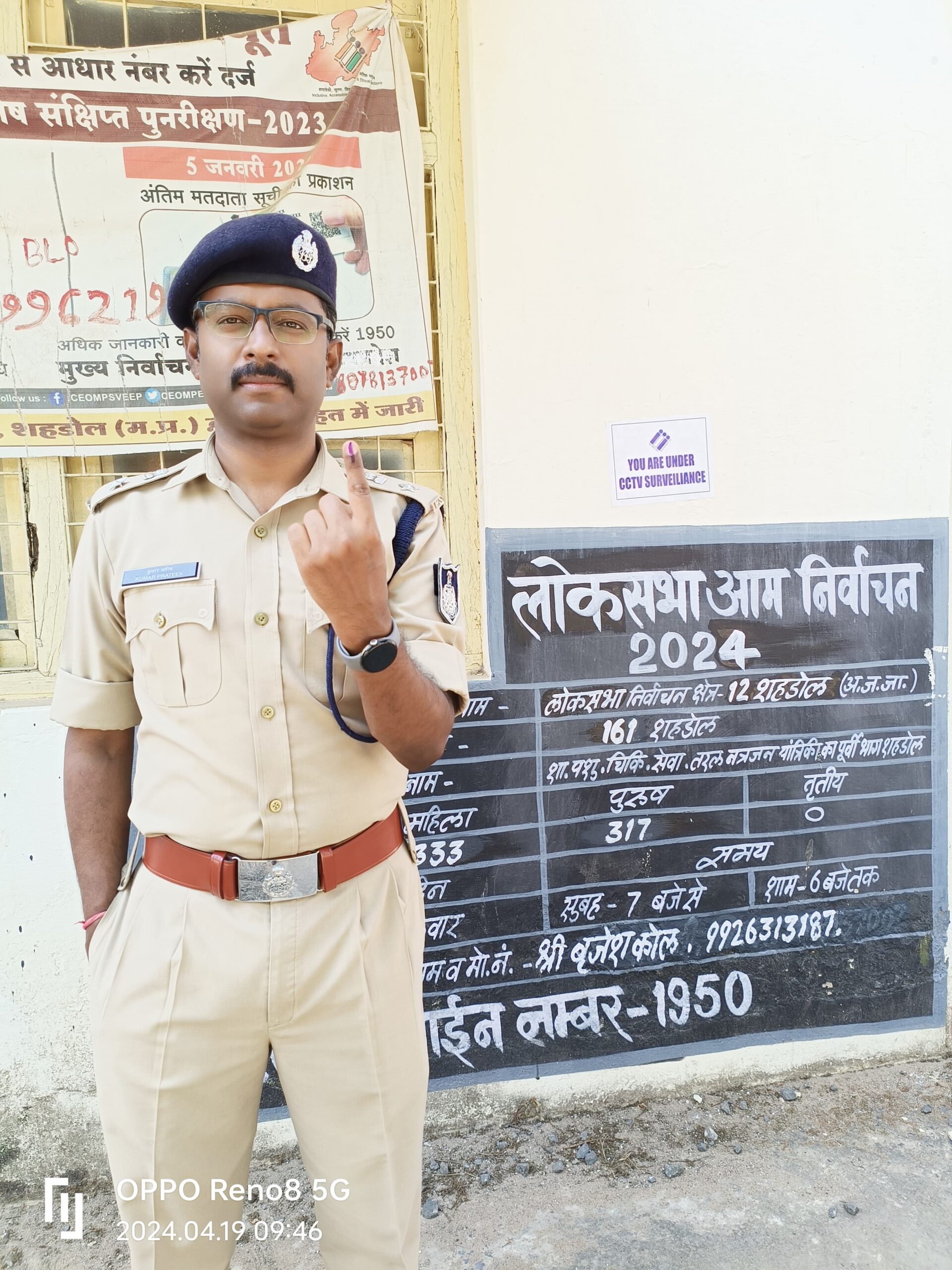 पुलिस अधीक्षक शहडोल श्री कुमार प्रतीक ने मुख्यालय शहडोल के पोलिग बूथ नंबर 161 के मतदान केंद्र में पहुंचकर लोकतंत्र के इस महा पर्व में मताधिकार का प्रयोग कर अपना फर्ज निभाया।