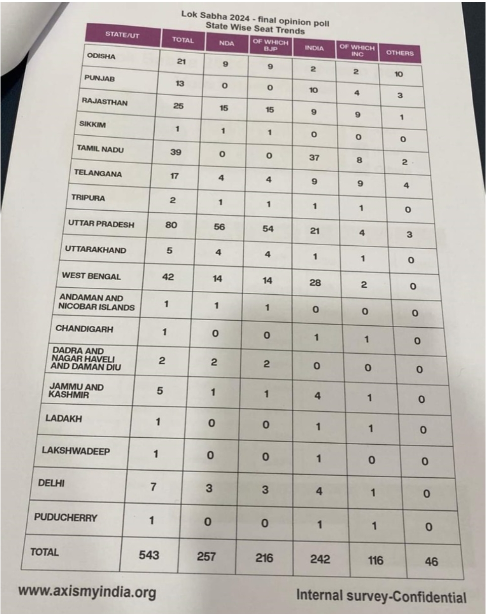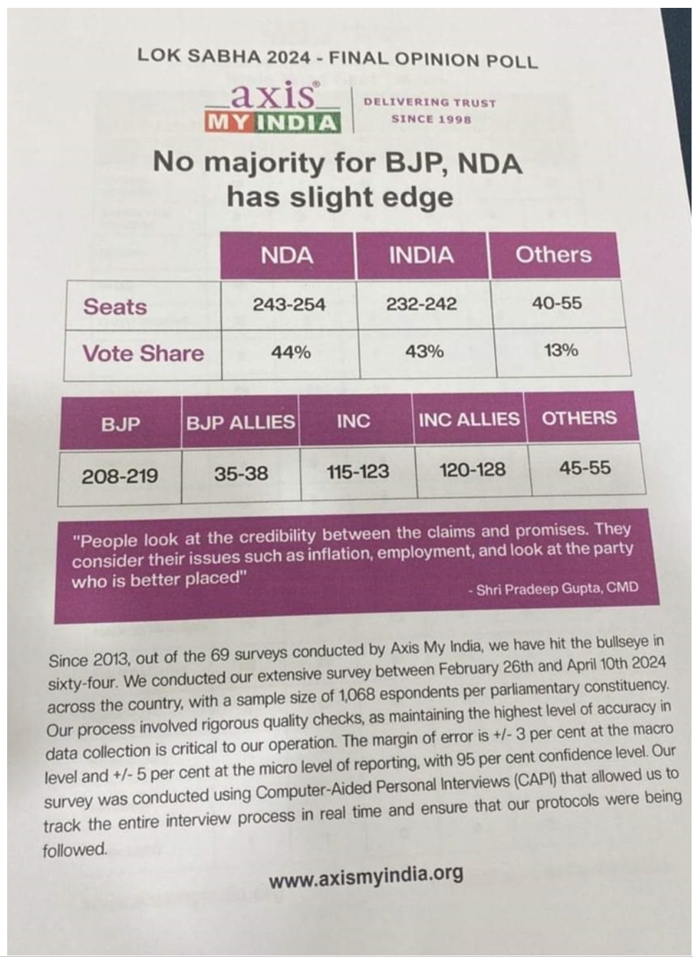 गौरतलब है कि एक्सिस माई इंडिया के अब तक 69 चुनावी सर्वेक्षणों में से 64 सही साबित हुए है।