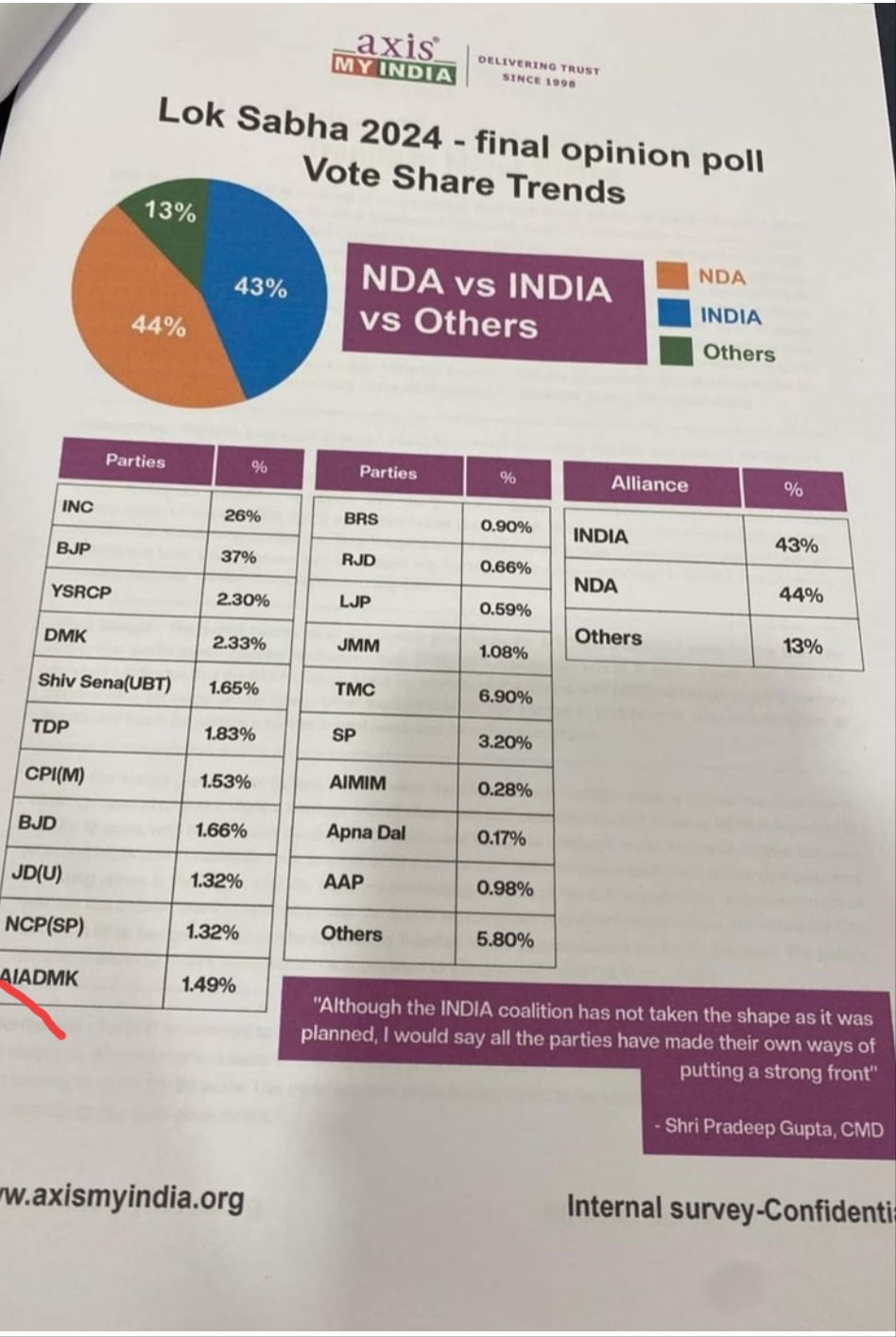 इस ओपिनियन पोल के मुताबिक एनडीए को 44% वोट और इंडिया गठबंधन को 43% वोट मिलने का अनुमान है जो सिर्फ एक फीसदी कम है। मामूली बढ़त है।