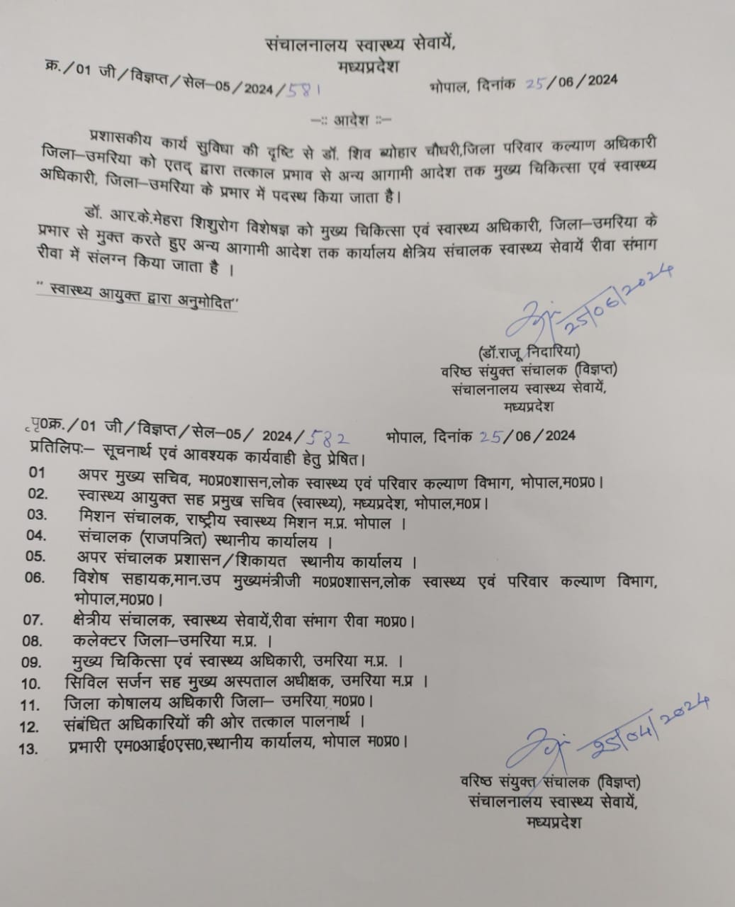 उमरिया जिले के स्वास्थ्य एवं चिकित्सा अधिकारी डॉक्टर आर के मेहरा को नेशनल हाइवे में शराब पीकर बाइक चलाना और नशे में गिरना मंहगा पड़ गया। बीबीसी की ख़बर को तत्परता से लेते हुए डॉक्टर राजू निदरिया (वरिष्ठ संयुक्त संचालक) संचनालय स्वास्थ्य सेवायें भोपाल ने मामले को संज्ञान में लिया, एवं तत्काल डॉक्टर आर के मेहरा को स्वास्थ्य एवं चिकित्सा अधिकारी के प्रभार से मुक्त करते हुए कार्यालय क्षेत्रीय संचालक स्वास्थ्य सेवायें रीवा संभाग रीवा में अटैच कर डॉक्टर शिव व्योहार चौधरी परिवार कल्याण अधिकारी उमरिया को स्वास्थ्य एवं चिकित्सा अधिकारी उमरिया का प्रभार तत्काल प्रभाव से सौंप दिया।