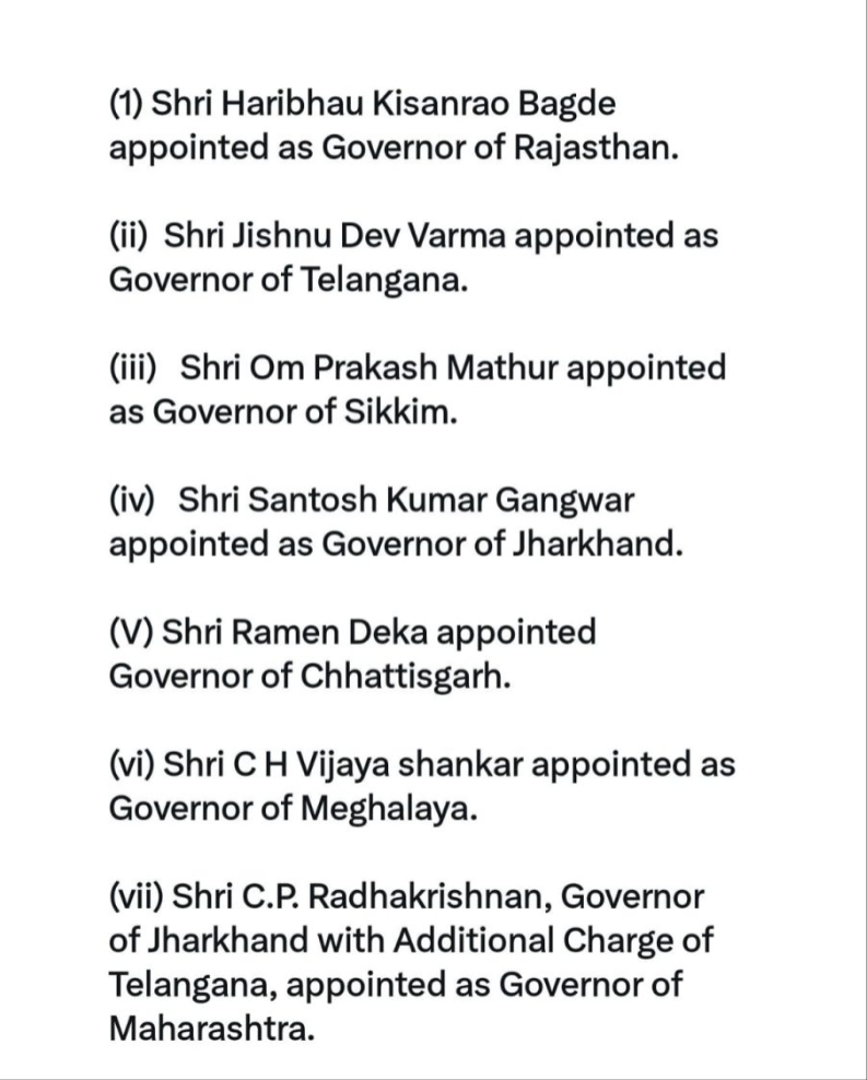 वहीं, संतोष कुमार गंगवार को झारखंड का राज्यपाल बनाया गया है और त्रिपुरा के पूर्व डिप्टी सीएम जिष्णु देव वर्मा को तेलंगाना का नया राज्यपाल नियुक्त किया गया है और हरिभाऊ किशनराव बाग्डे को राजस्थान बनाया गया है, जबकि सी.एच. विजयशंकर को मेघालय का राज्यपाल नियुक्त किया गया है.