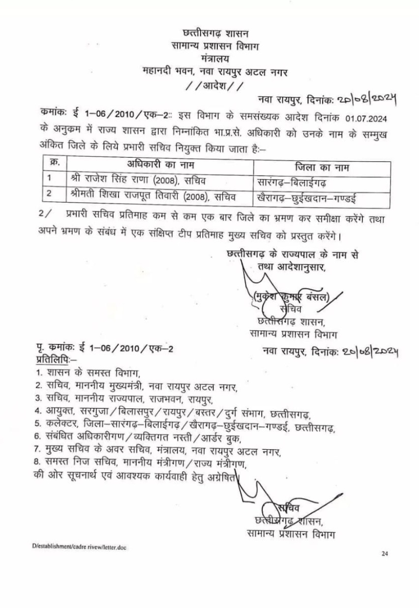 2008 बैच के IAS राजेश सिंह राणा को सारंगढ़ बिलाईगढ़ का प्रभारी सचिव बनाया गया है, तो वहीं शिखा राजपूत तिवारी खैरागढ़- छुईखदान-गंडई की प्रभारी सचिव होगी। जीएडी की तरफ से जारी आदेश के मुताबिक प्रभारी सचिव को महीने में कम से कम एक बार जिले का भ्रमण कर समीक्षा करनी होगी। भ्रमण से संबंधित टीप चीफ सेकरेट्री को भेजना होगा। इससे पहले राज्य सरकार ने 1 जुलाई 2024 को प्रभारी सचिव की नियुक्ति का आदेश जारी किया था