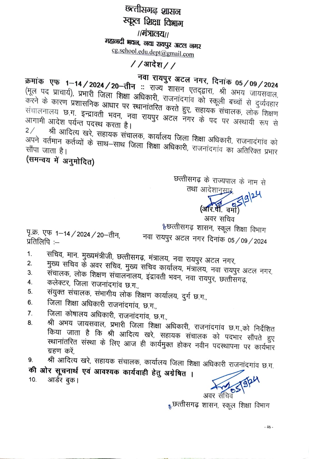 नवा रायपुर अटल नगर दिनांक 05/09/2024 2/ श्री आदित्य खरे सहायक संचालक कार्यालय जिला शिक्षा अधिकारी राजनादगांव को अपने वर्तमान कर्तव्यों के साथ-साथ जिला शिक्षा अधिकारी राजनांदगांव का अतिरिक्त प्रभार सौंपा जाता है