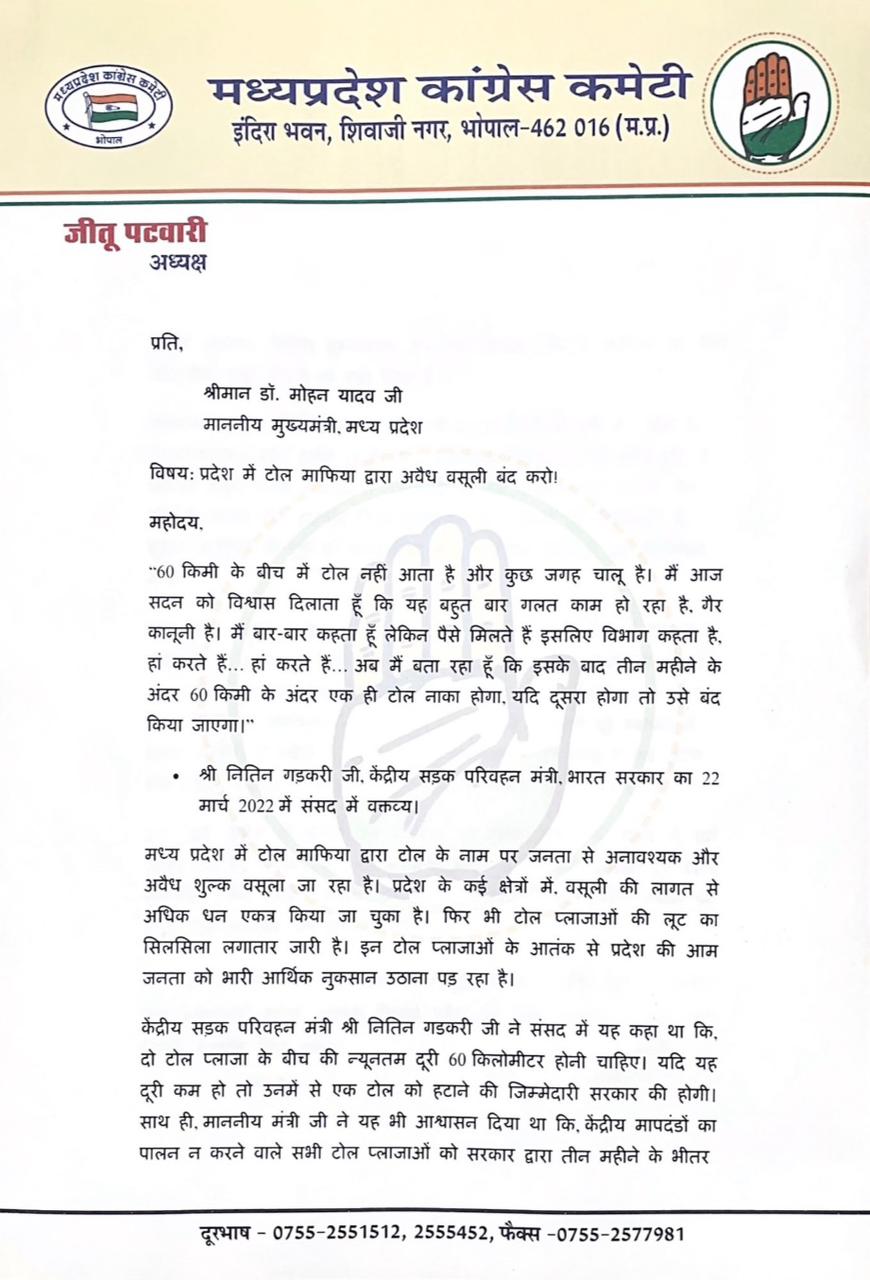 अवैध टोल बंद कराने कांग्रेस ने मुख्यमंत्री को लिखा पत्रः जीतू पटवारी बोले- एक महीने बाद टोलों पर बैठकर करेंगे आंदोलन