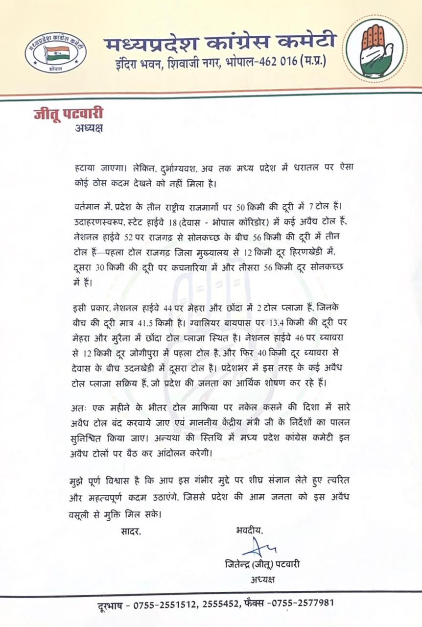 जीतू पटवारी ने बताया कि नेशन हाइवे की गाइडलाइन के अनुसार 60 किलोमीटर के बीच टोल नहीं होना चाहिए किंतु कई जगह अवैध टोल चल रहे है। इस संबंध में केंद्रीय सड़क परिवहन मंत्री नितिन गडकरी ने मार्च 2022 में संसद में वक्तव्य दिया था। इसके बाद भी मध्यप्रदेश में टोल माफिया द्वारा टोल के नाम पर जनता से अवैध रूप से वसूला जा रहा है। उन्होंने पत्र में बताया है कि नेशनल हाइले 44 पर मेहरा और छेंदा में दो टोल प्लाजा है।इसी तरह देवास भोपाल कारिडोर पर कई टोल प्लाजा है