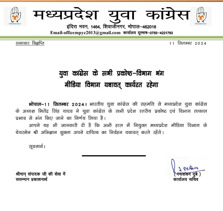 मध्य प्रदेश यूथ कांग्रेस अध्यक्ष मितेंद्र सिंह यादव ने सभी प्रकोष्ठ और विभाग को भंग कर दिया है अब इनमें नए सिरे से नियुक्ति होगी। मीडिया विभाग के अध्यक्ष अभिज्ञान शुक्ला को छोड़कर सभी विभाग डिजॉल्व कर दिए गए हैं