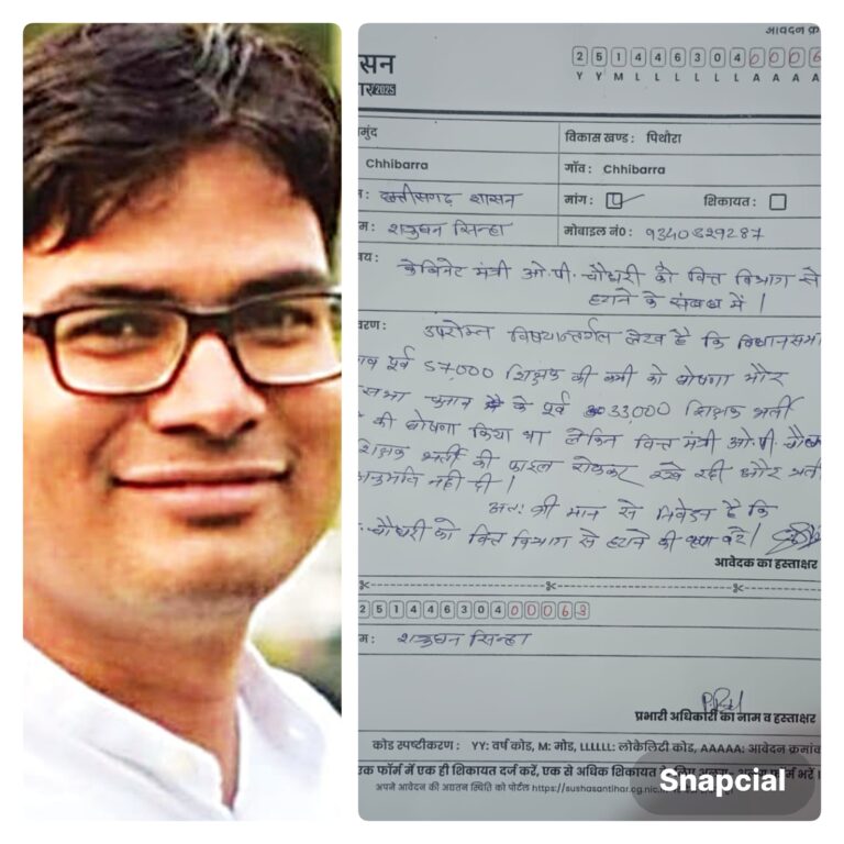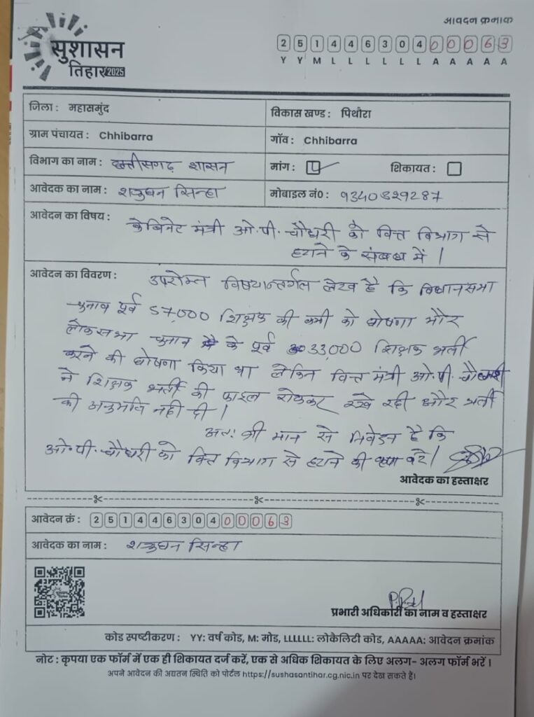 इसी बीच ग्राम छिबर्रा के युवक शत्रुघन सिन्हा जो शिक्षक भर्ती के लंबित रहने और चुनाव पूर्व 57हजार शिक्षकों के रिक्त पद था जिसमें चुनाव पश्चात 33हजार शिक्षकों के रिक्त पदों पर भर्ती की घोषणा की गई थी जिसे वित्त विभाग की मंजूरी नहीं मिली जिसके चलते शिक्षक भर्ती रुकी हुई है जिसका जिम्मेदार वित्त मंत्री ओपी चौधरी को मानते हुये उनको वित्त मंत्री पद से हटाने की माँग की हैl